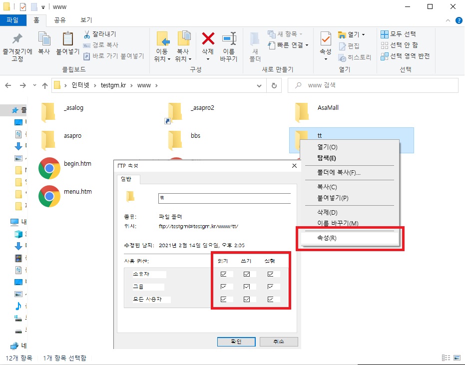 복사가 완료되면 퍼미션 설정을 위하여 해당 폴더 속성에서 "모두 체크 표시"를 해 주십시오.
