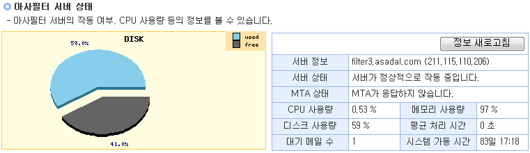 - (6) 디스크 사용량 : 현재 필터 서버의 디스크 사용량(90% 넘으면 위험)