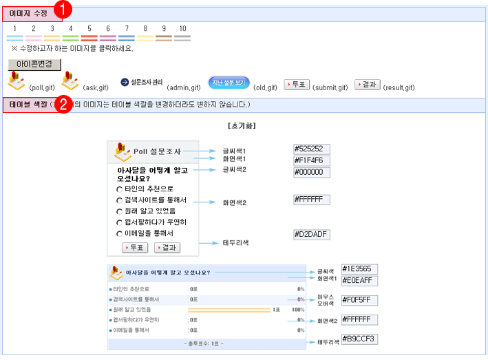 1. 이미지 수정 : 설문조사의 그래프 이미지 수정이 가능하며 아이콘 변경을 클릭하면 사용자가 직접 제작한 아이콘으로 변경 가능합니다.
