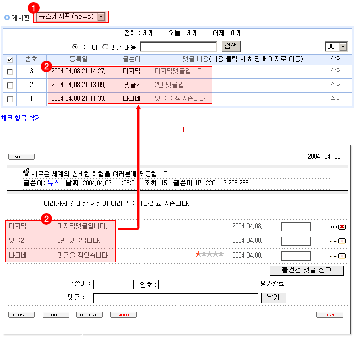 게시판 내용에 댓글을 올릴 수 있으며, 올려진 글에 대한 평가 불건전 댓글의 경우 담당자에게 신고도 할 수 있습니다.