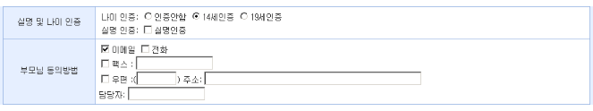 3. 실명 및 나이인증 : 실명인증 및 나이인증 필요 시 선택하시면 됩니다.(14세인증 : 부모님 동의방법에서 원하시는 항목에 체크를 하신 후 입력란에 필요한 정보를 입력하시면 됩니다.실명인증 : 인증사를 선택하신 후 입력란에 필요한 정보를 입력하시면 됩니다.)