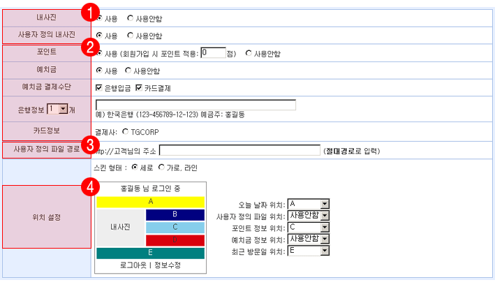4. 위치 설정 : 스킨형태를 선택할 수 있고 사용자 정의 파일, 포인트 정보, 예치금 정보, 최근 방문일, 오늘 날짜 위치를 정할 수 있습니다.