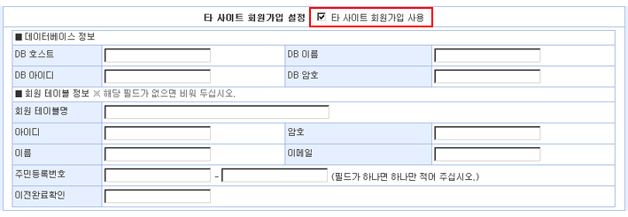 데이터베이스 정보에는 회원정보를 가져올 타사이트의 DB 호스트명 , DB 이름, DB 아이디, DB 암호 등을 정확히 입력합니다.