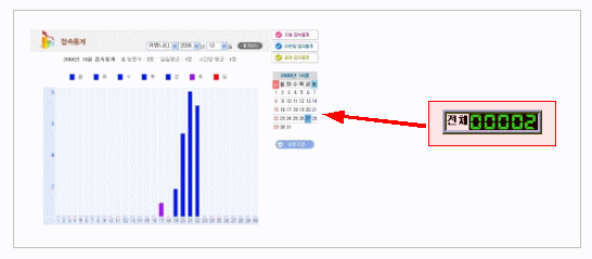 - 카운터를 클릭하면 접속통계가 보입니다. 관리자모드의 접속통계>환경설정에서 카운터의 링크설정을 연결안함으로 설정하셨을 경우에는 카운터가 클릭되지 않습니다.